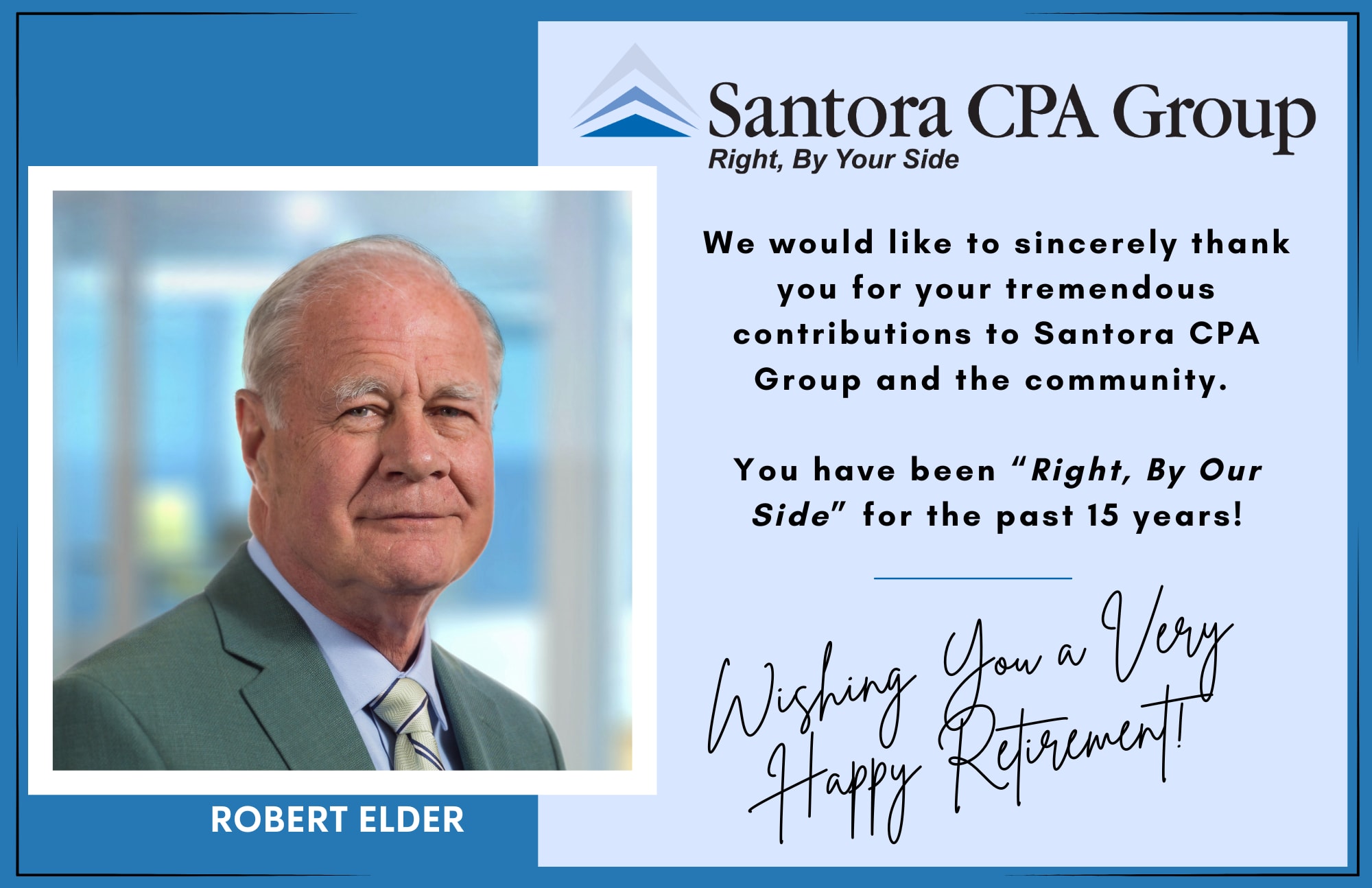 This month a dedicated DCA member will be drawing to close a long and meaningful career. Robert (Bob) Elder, has contributed to Santora CPA Group’s success as its Director of Marketing for the past 15 years but before that he achieved success in multiple arenas. Bob served his country as a U. S. Navy officer and Swift Boat captain during the Vietnam War. He was a banking executive during the heyday of banking expansion in Delaware ultimately becoming the President of more than one bank. He has served on numerous non-profit boards.